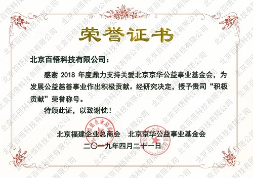 奮力奔跑,同心追夢(mèng)。4月21日晚,北京福建企業(yè)總商會(huì)2019公益慈善年會(huì)在北京國(guó)際會(huì)議中心召開(kāi)。百悟科技受邀出席并憑借對(duì)京華公益事業(yè)基金會(huì)的支持獲得“積極貢獻(xiàn)”榮譽(yù)稱號(hào)。